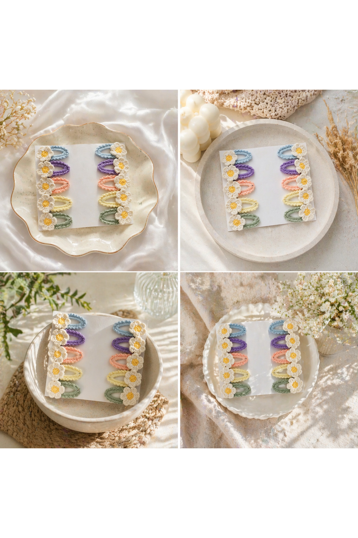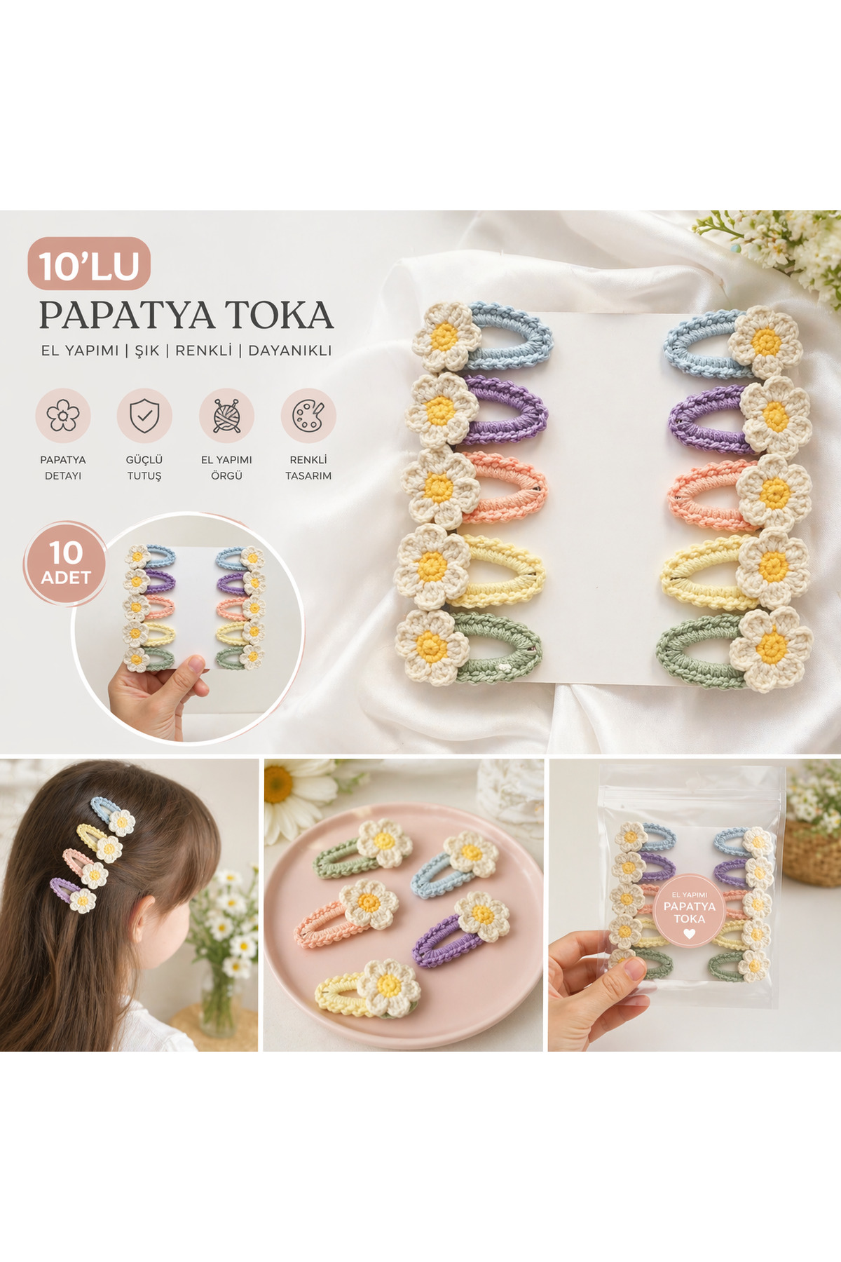 %100 Pamuk El Yapımı Örgü 10’lu Çiçek Çıtçıt Toka – Bebek & Kız Çocuk Saç Aksesuarı