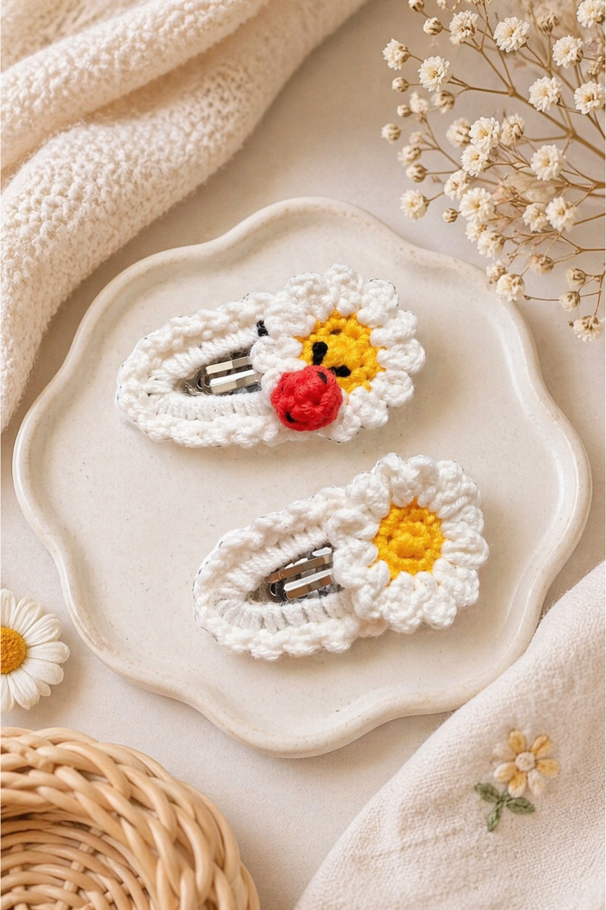%100 Pamuk El Yapımı Örgü 2’li Çıtçıt Toka – Bebek & Kız Çocuk Saç Aksesuarı
