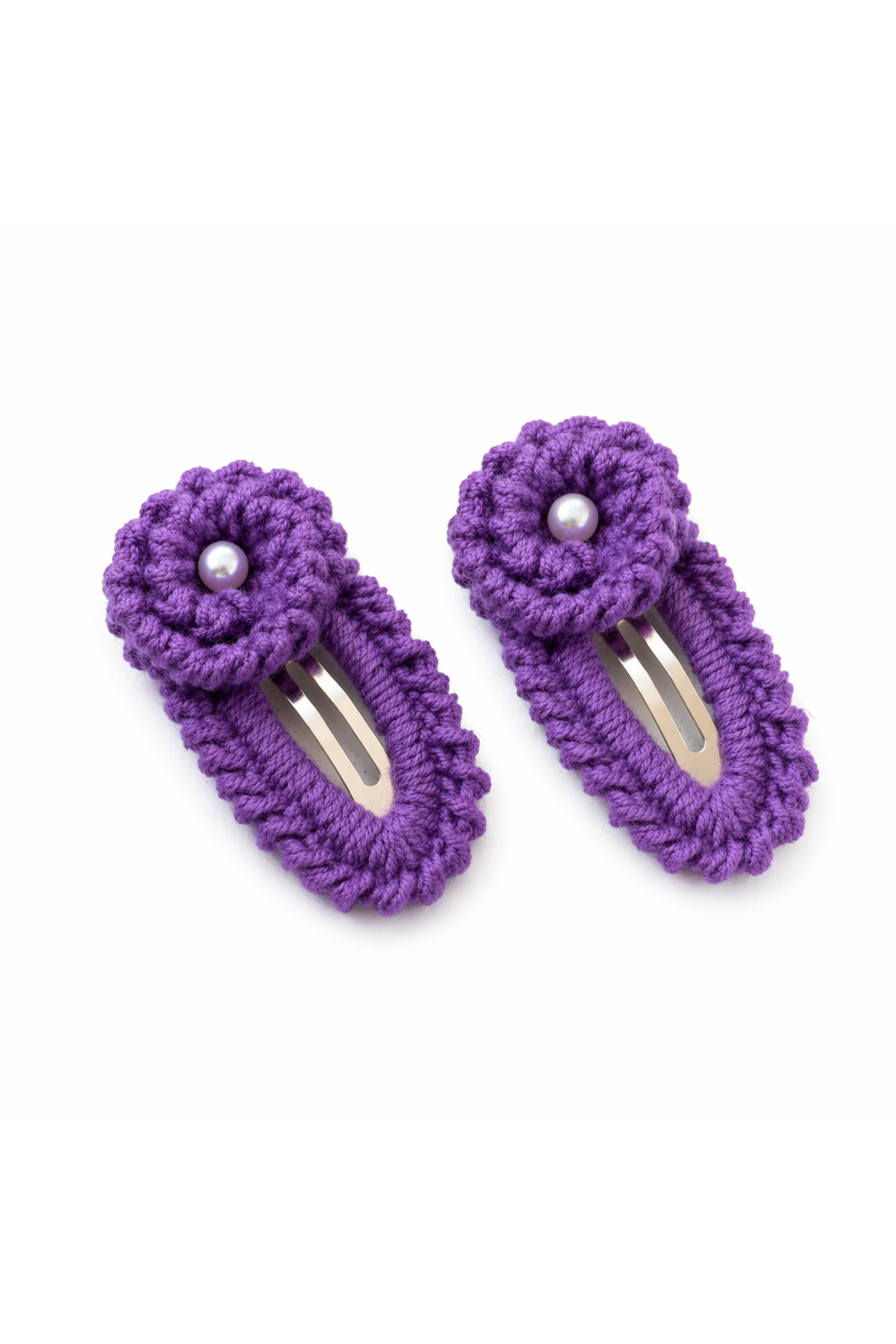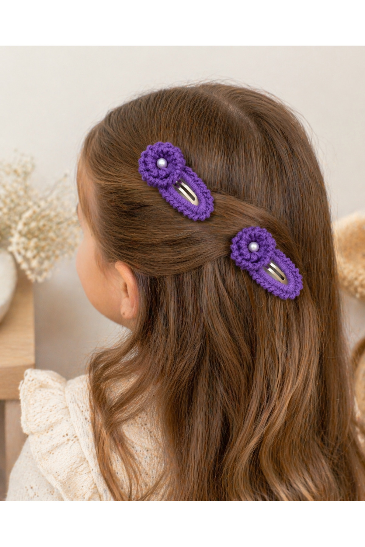%100 Pamuk El Yapımı Örgü 2’li Mor Çiçek Çıtçıt Toka – Bebek & Kız Çocuk Saç Aksesuarı