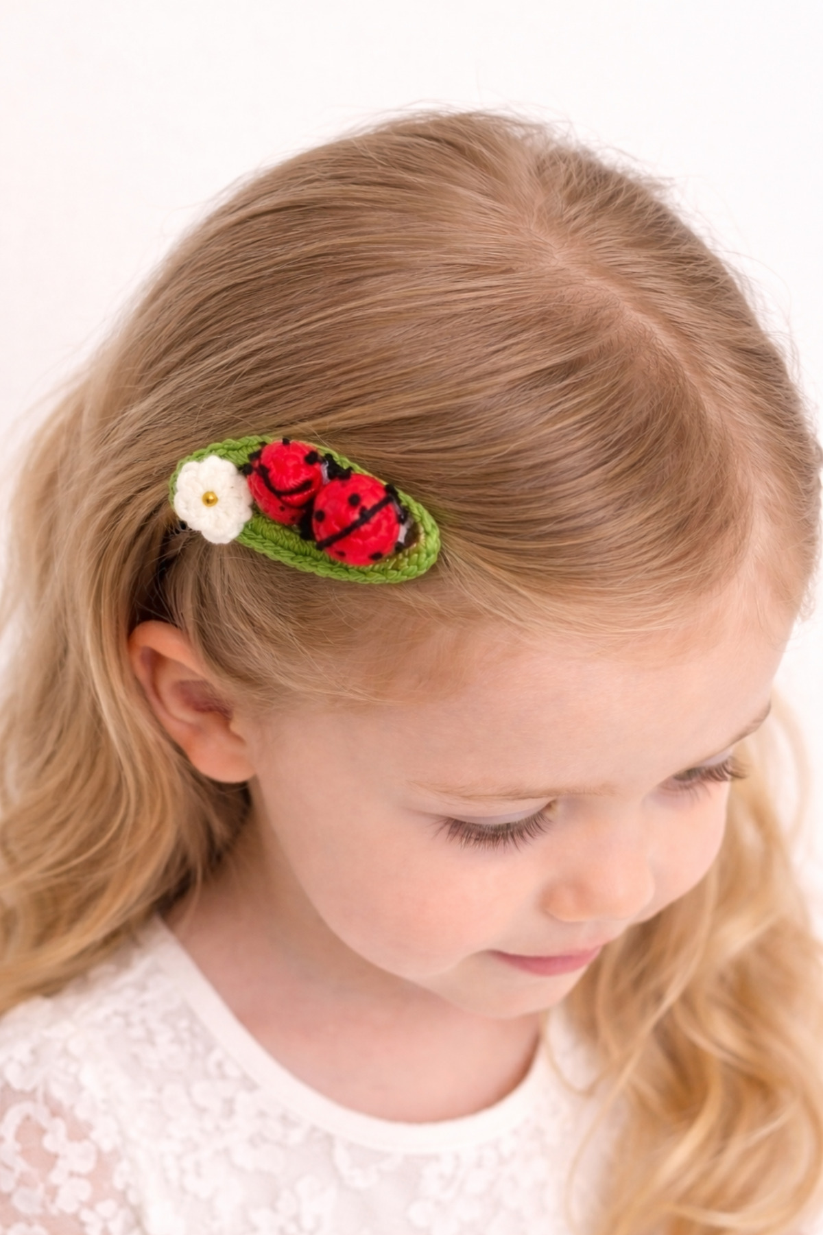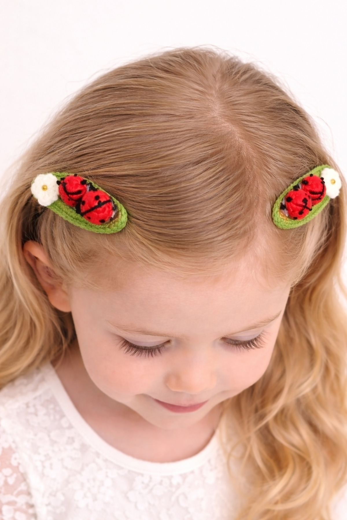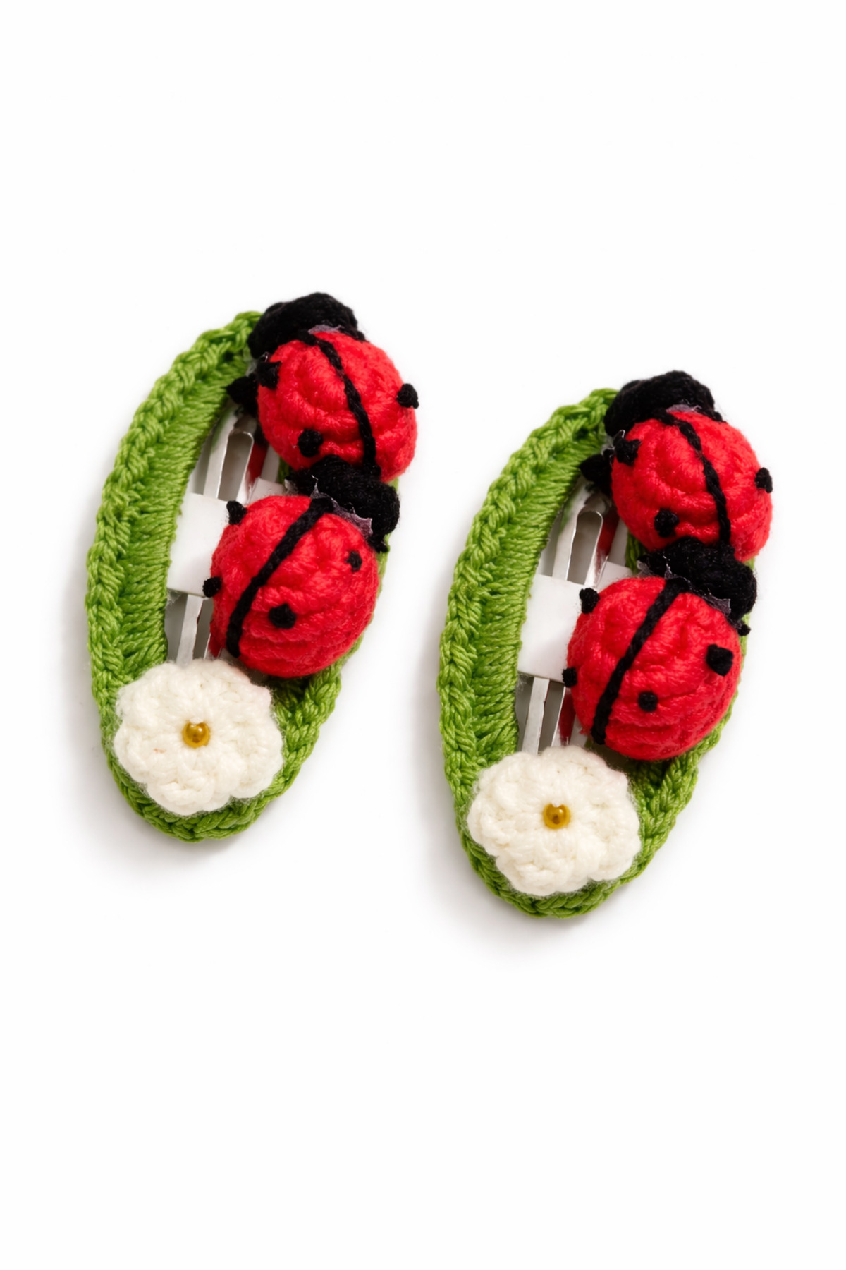 %100 Pamuk El Yapımı Örgü 2’li Uğur Böcekli Çıtçıt Toka – Bebek & Kız Çocuk Saç Aksesuarı