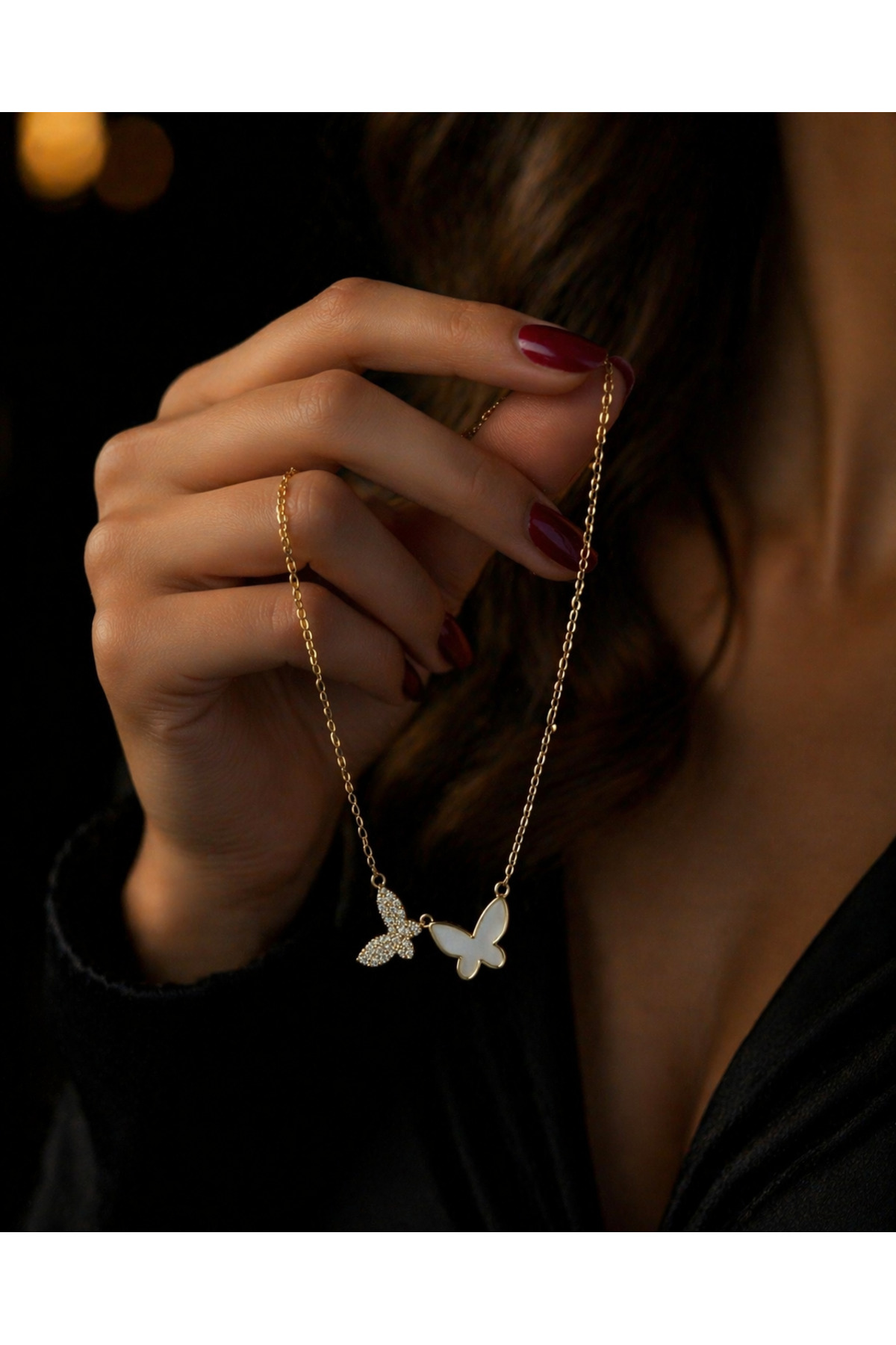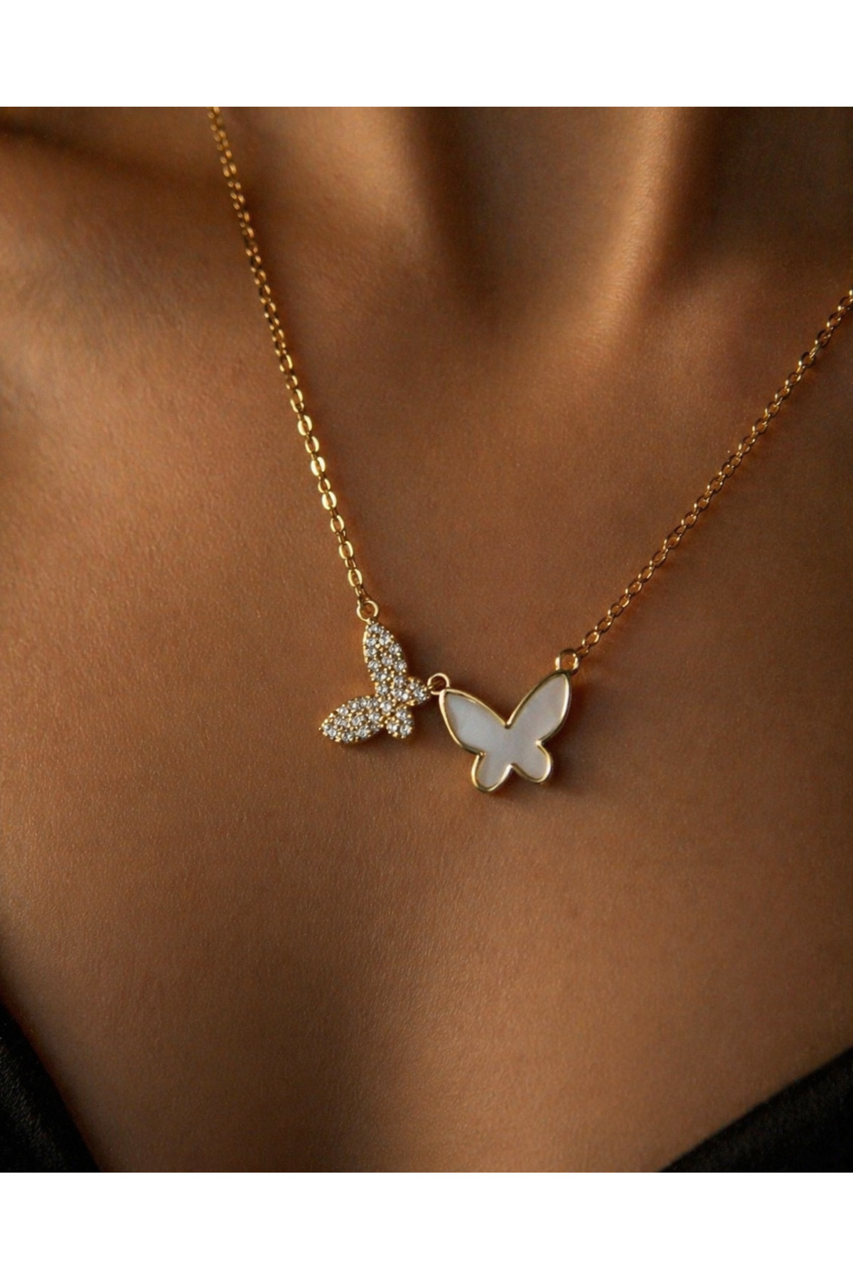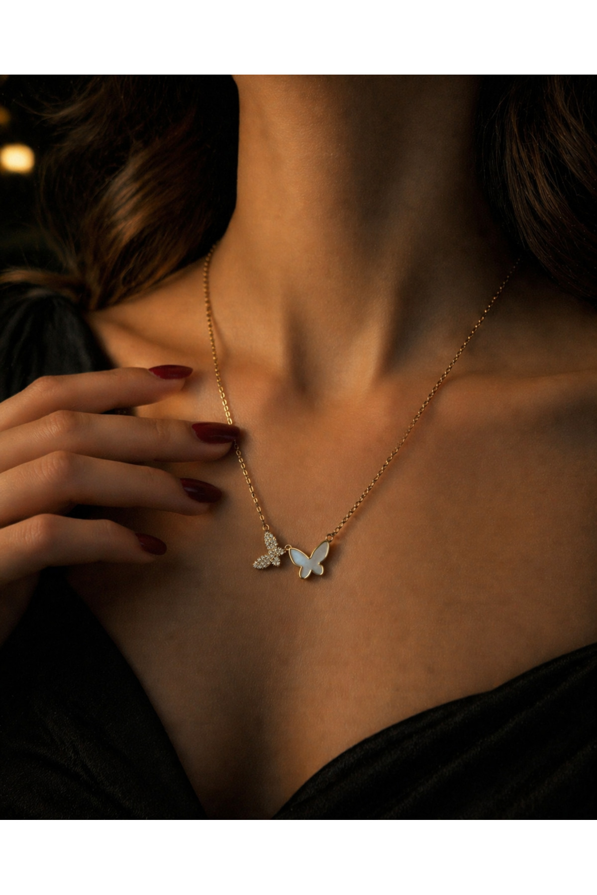 – Zarif tasarımıyla dikkat çeken çift kelebek figürlü kolye, her kombininize şıklık katacak.; – Paslanmaz çelik materyali sayesinde uzun ömürlü kullanım sunar ve kararmaya karşı dayanıklıdır.; – Her yaş grubuna hitap eden bu kolye, hem genç hem de yetişkin kadınlar için ideal bir aksesuardır.; – Özel günlerde veya günlük kullanımda tercih edebileceğiniz bu kolye, stilinizi tamamlayacak zarif bir dokunuş sağlar.; – Taş detayları ile göz alıcı bir görünüm sunan bu kolye, her türlü kıyafetle uyum sağlar.; – Bakım kolaylığı sağlayan yapısı ile pratik bir kullanım imkanı sunar.;